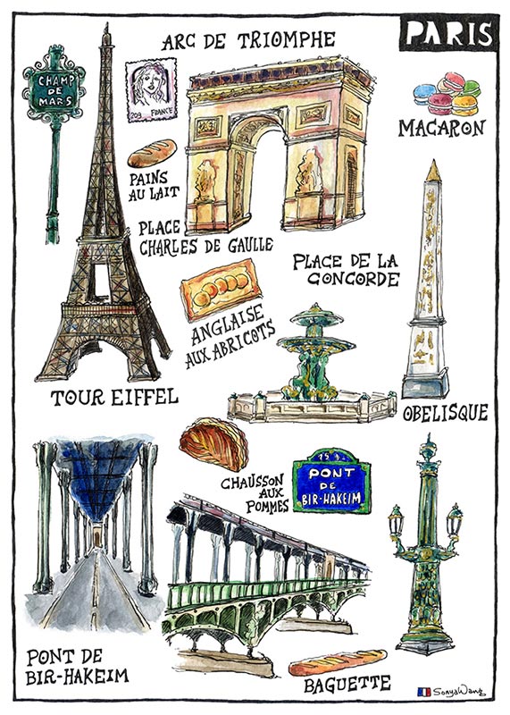 In Paris #1 location: Paris, France spots: Arc de Triomphe, Place Charles de Gaulle, Tour Eiffel, Place de la Concorde, Obélisque,Pont de Bir-hakeim food & dessert: Pains au Lait, Macaron, Anglaise aux Abricots, Chausson aux pommes
