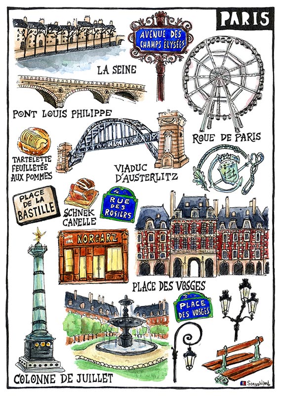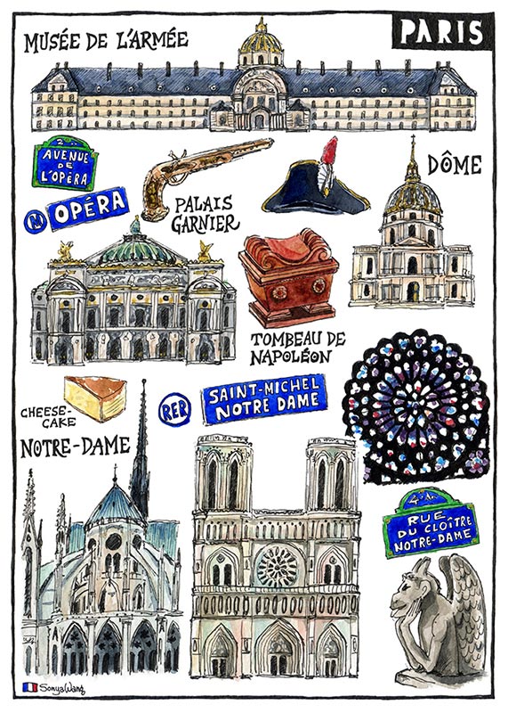location: Paris, France drawing materials & tools: Maruman Soho 301(B6), black pen, water brush, and watercolor