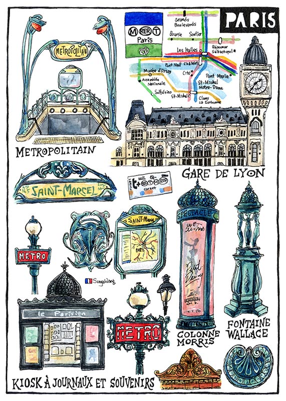 In Paris #9 location: Paris, France spots: Metropolitain, Gare de Lyon, Kiosk à Journaux et Souvenirs, Colonne Morris, Fontaine Wallace