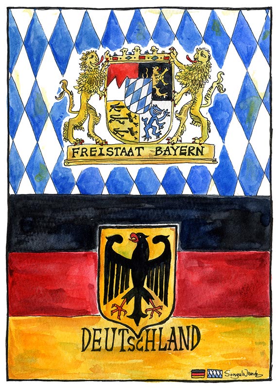Welcome to Germany location: Munich, Germany up: Flag of Bavaria down: Common unofficial flag variant with the coat of arms of Germany.