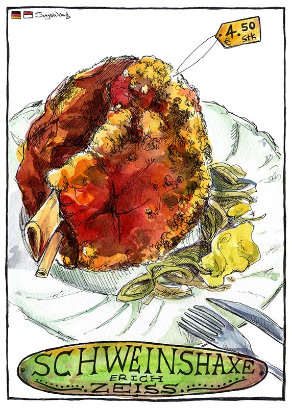 Schweinshaxe location: Frankfurt, Germany Schweinshaxe in German cuisine, is a roasted ham hock (or pork knuckle). Usually served with Bratkartoffeln (fried potatoes) and Sauerkraut.